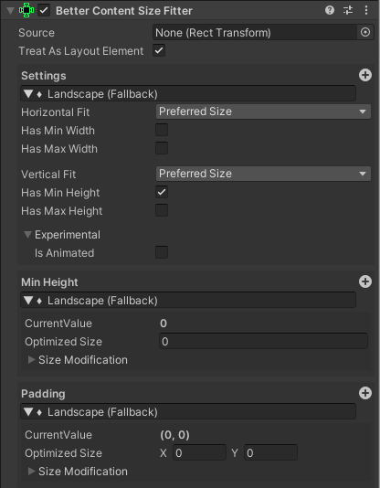 - The Better Content Size Fitter has a child and references this child as source. It has "Treat As Layout Element" enabled and Horizontal and / or Vertical Fit set to "Preferred Size".