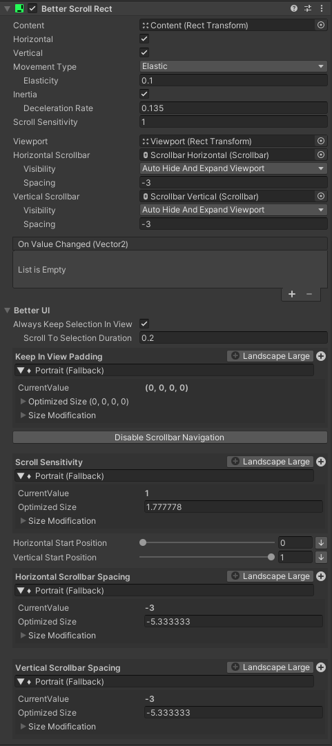 The Scroll Sensitivity in the Better UI Section is a Size Config Collection and overrides the Scroll Sensitivity of the base Scroll Rect. Therefore, the other Scroll Sensitivity field further up in the inspector cannot be changed directly.
