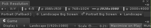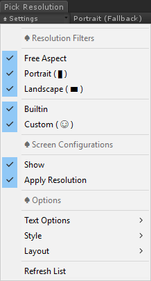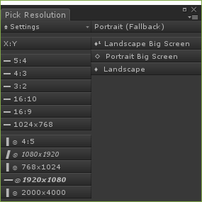 The Pick Resolution Window is a shortcut to change resolutions with one click. When working with different resolutions it can be very annoying to use the resolution drop down of the game view all the time. It is a lot faster to just click a button which is not hidden inside a drop down.