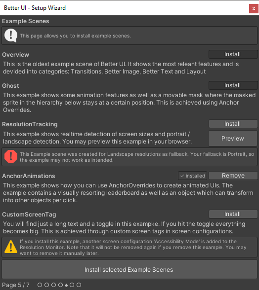 This Page allows you to install / remove example scenes. You can find all installed example scenes in the folder Assets/TheraBytes/BetterUI_Examples.