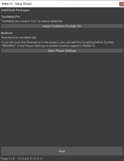 After importing Better UI into your project, a wizard window should appear guiding you through several pages in order to setup Better UI correctly for your project.