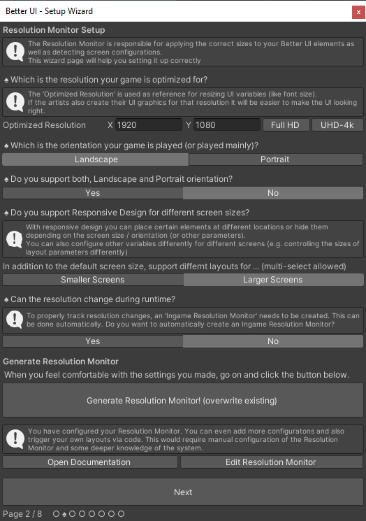 If the wizard detects that you did the wizard before or have a ResolutionMonitor asset already in your project, the welcome page looks differently and allows you to jump to any page you like (since you shouldn't recreate the ResolutionMonitor).